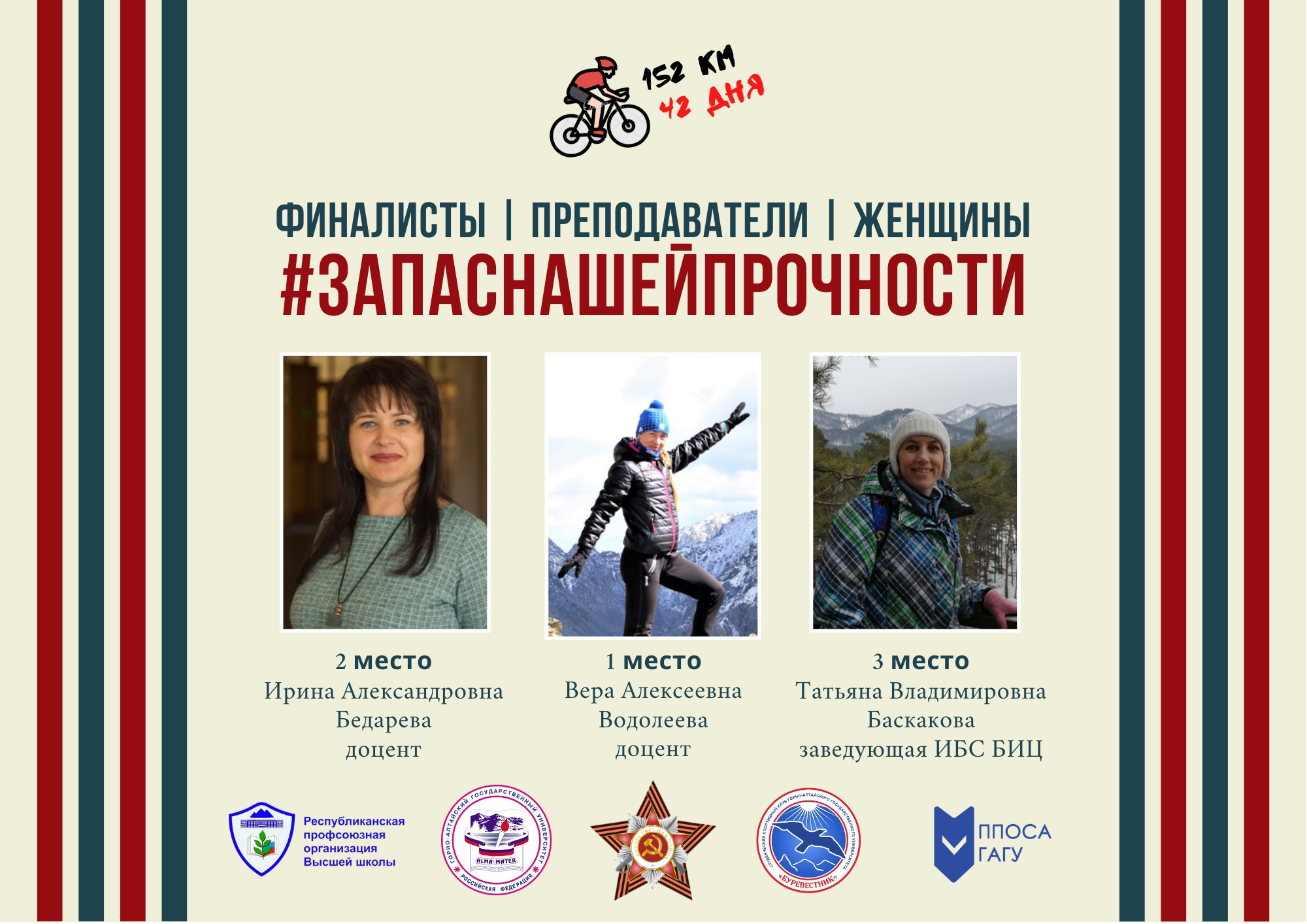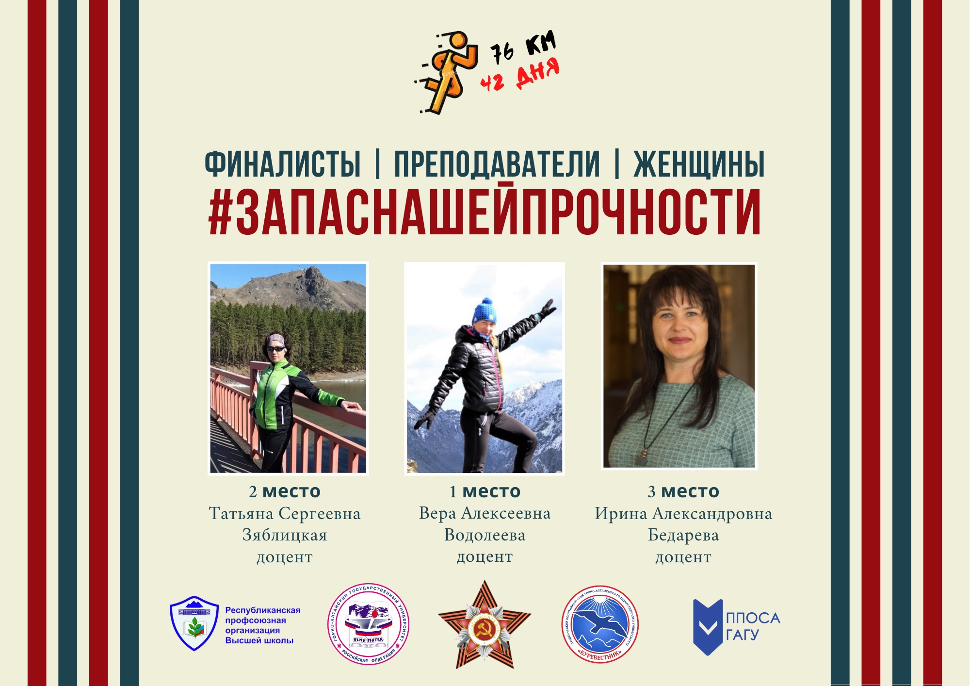 9 мая завершились online-соревнования «Запас прочности», посвящённые 76-летию Победы в Великой Отечественной войне. В мероприятии приняли участие 39 спортсменов: сотрудники, преподаватели и студенты Горно-Алтайского государственного университета. Только 50% из них удалось преодолеть дистанцию в 76 км бегом или 152 км на велосипеде.