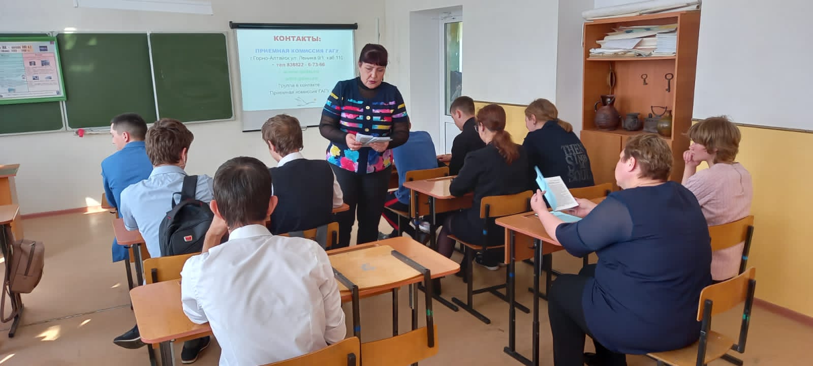 Г. Б. Рупасова подробно рассказала об условиях приема в 2022 году, преимуществах поступления в Горно-Алтайский государственный университети обучения в нем, материально-технической базе университета, об организации вузом досуговой деятельности, студенческих объединениях университета и видах дополнительного образования на базе вуза. Преподаватели говорили о развитии университета, направлениях подготовки и новых профилях обучения, а также о перспективах трудоустройства и карьерного роста по окончании обучения. Учащиеся получили буклеты факультетов ГАГУ, содержащие всю необходимую для абитуриента информацию. Несмотря на то, что большинство выпускников уже определились с выбором вуза, ребятам порекомендовали рассмотреть возможность поступления в ГАГУ.