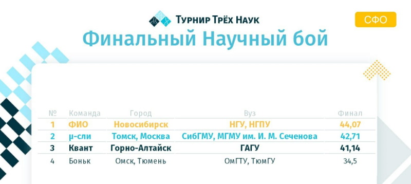 15 мая завершился региональный этап Федерального студенческого Турнира Трех Наук по Сибирскому и Дальневосточному округам, проходивший в очном формате в Новосибирске. В результате упорной борьбы команда ГАГУ вышла сначала в финал, а по итогам финального четырехкомандного научного боя заняла третье место.