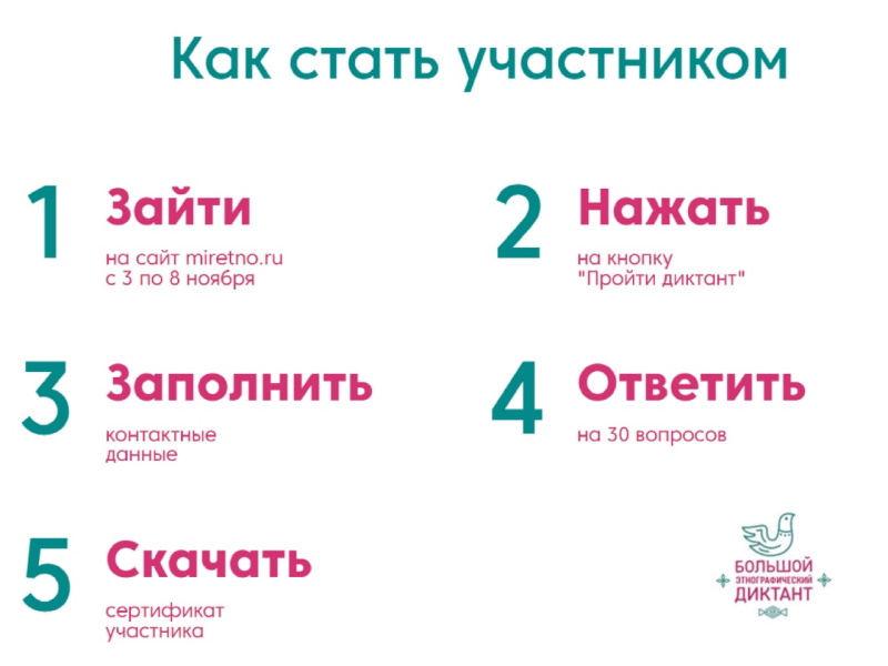 С 3 по 8 ноября 2022 года приглашаем принять участие в Международной просветительской акции «Большой этнографический диктант» в онлайн-формате на сайте: https://miretno.ru