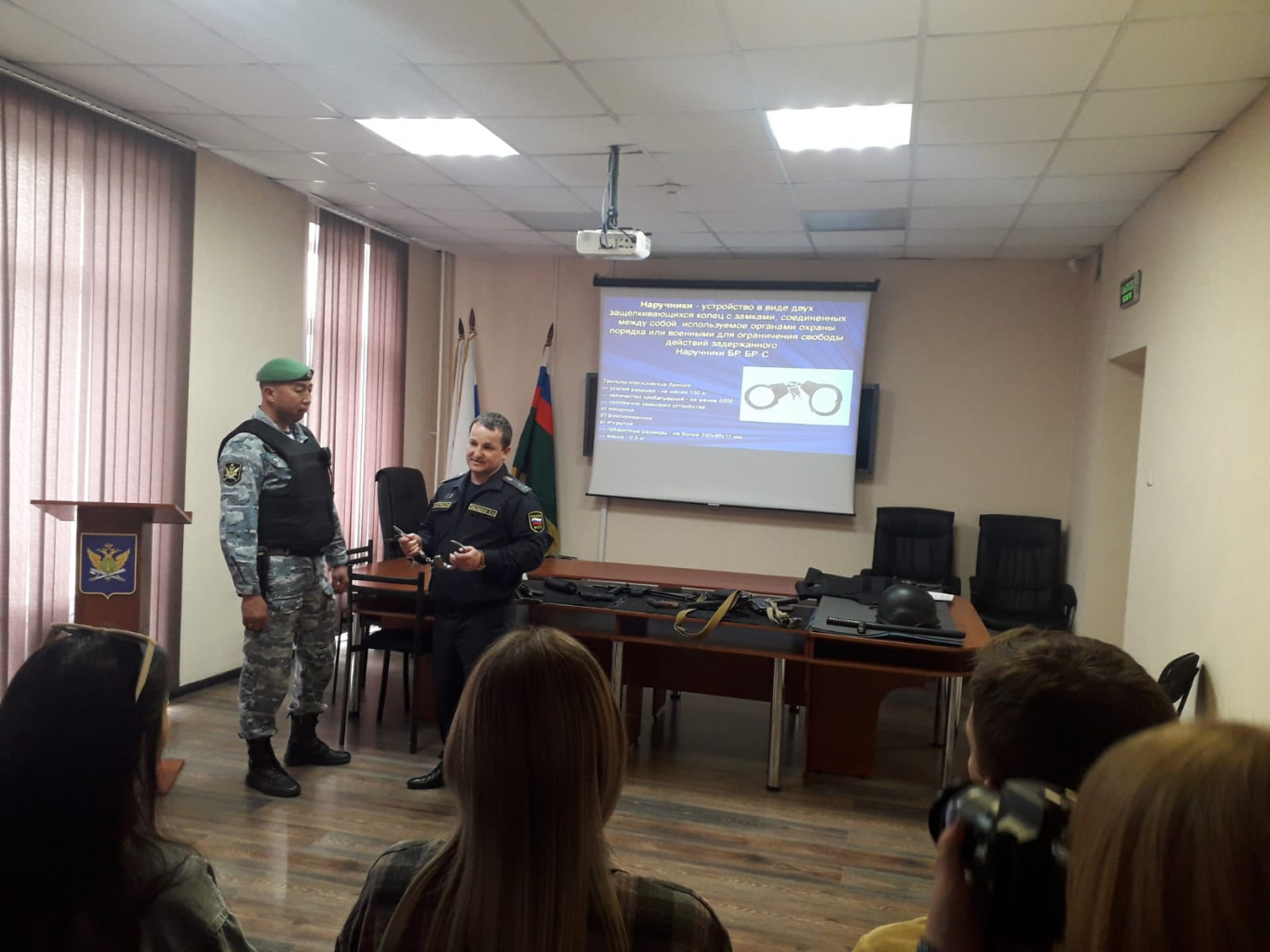 Сотрудники службы приставов рассказали студентам о тонкостях профессии, задачах, которые стоят перед управлением, о работе Интернет-сервиса официального сайта УФССП России по Республике Алтай «Банк данных исполнительных производств», полномочиях судебных приставов, трудностях, возникающих на их профессиональном пути, о порядке поступления на государственную гражданскую службу, требованиях, предъявляемых к кандидатам на должности судебных приставов. После проведенной беседы для студентов была организована экскурсия по структурным подразделениям управления. Кроме того, студентам продемонстрировали специальные средства и оружие подразделения специального назначения.