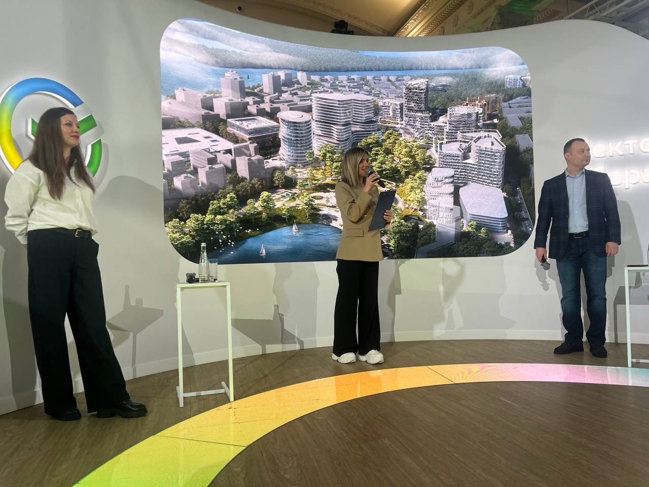 В первую смену я попала в павильон СберБанка. Моей задачей было направлять людей в лекторий на лекцию «Вакуумное мусороудаление в СберСити». Мне и самой посчастливилось поприсутствовать на этой лекции.