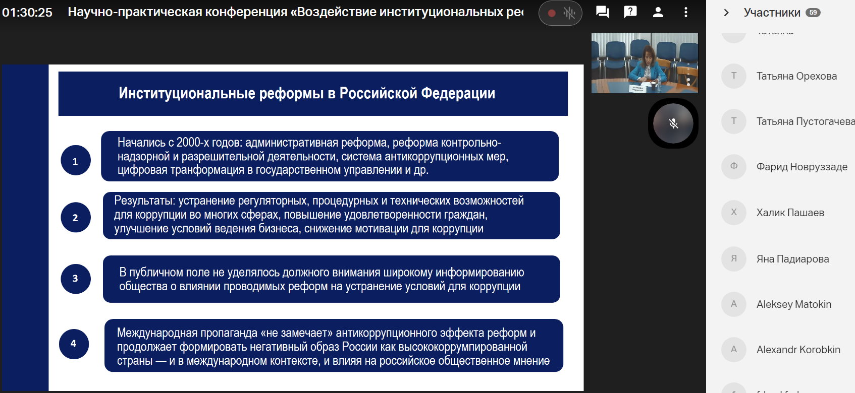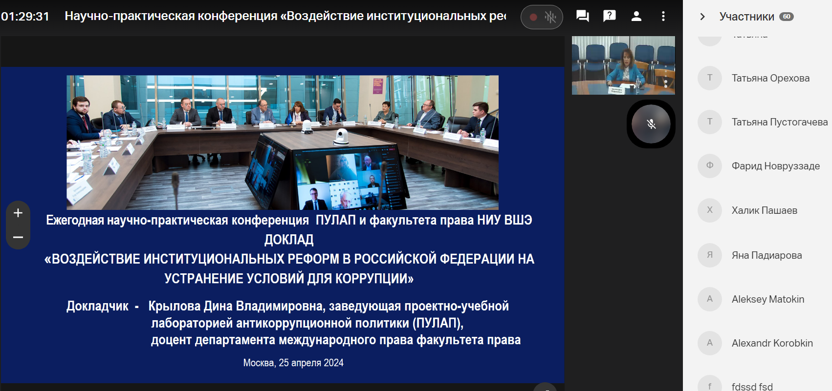 На конференции был представлен тематический доклад НИУ ВШЭ, подготовленный ПУЛАП, и обсуждены вопросы качественных результатов по устранению условий для коррупции вследствие реализации в России институциональных реформ: