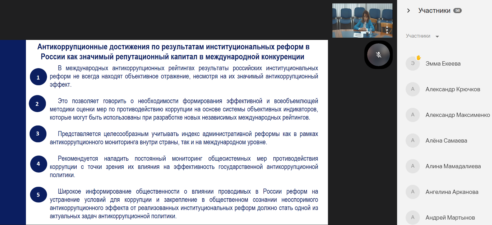 Также на конференции была рассмотрена проблема степени объективности межстрановых рейтингов в сфере госуправления и оценки уровня коррупции, предложены подходы, основанные на наличии инструментов госрегулирования, препятствующих коррупции.