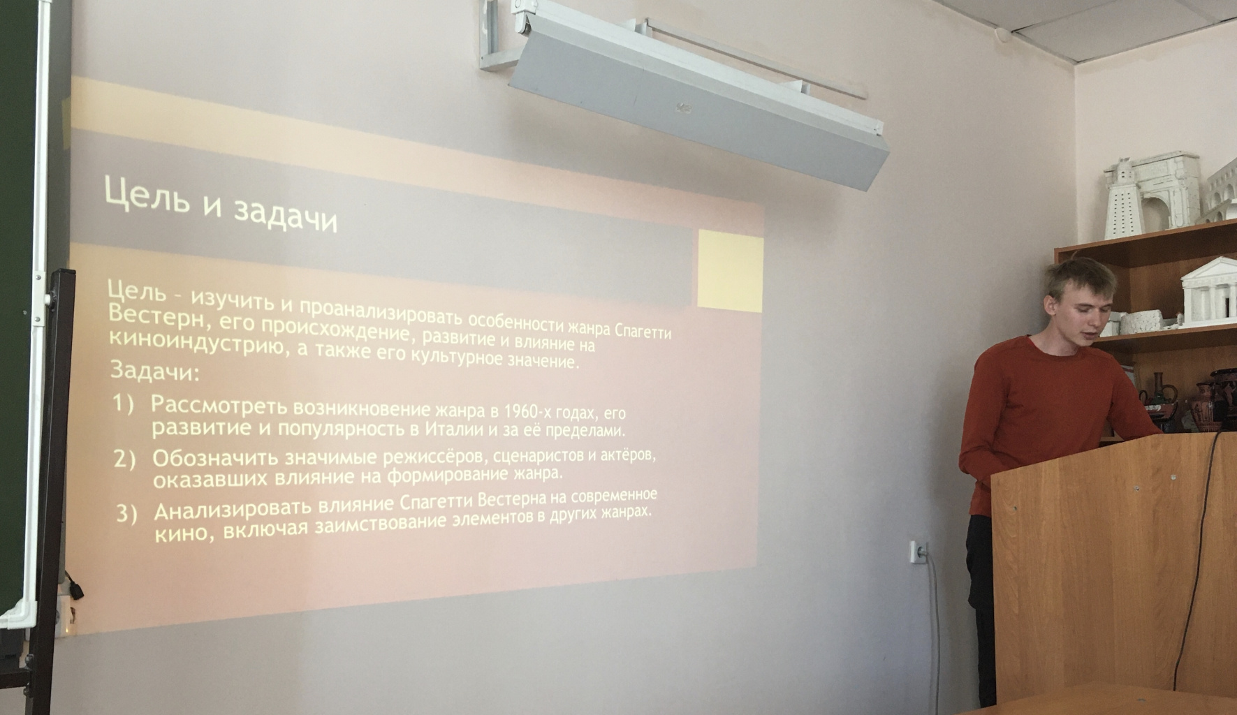 1 место занял студент 312 группы Артем Владимирович Вяткин, выступавший с докладом «Спагетти Вестерн» как жанр итальянского кино», научный руководитель к.и.н., доцент Ложкина Н.Н.