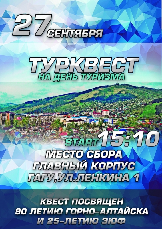 27 сентября, в Международный день туризма, приглашаем команды принять участие в туристическом квесте, посвященном 25-летию экономико-юридического факультета и 90-летию города Горно-Алтайска.