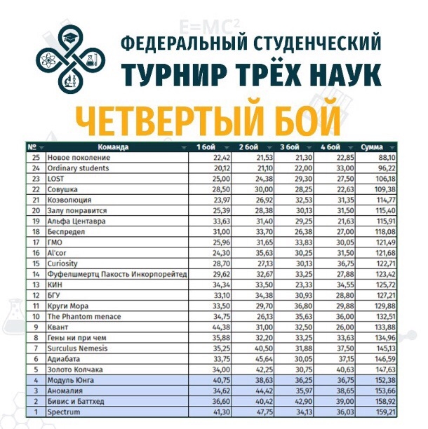 Игра была интересной и драматичной, так после первого боя наша команда была на первой строке рейтинга Турнира, второй бой переместил «Квант» на восьмую строку, затем была пятая позиция и после четвертого боя (с командой МГУ) наша команда оказалась на 9 месте. Поздравляем нашу молодую, перспективную команду с достойным выступлением и желаем успехов в новых боях Турнира Трех Наук!